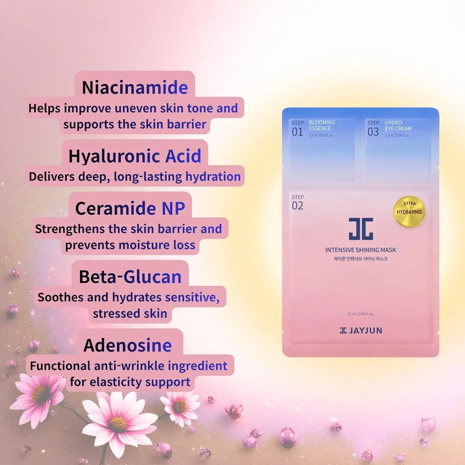 The JAYJUN Cosmetic Intensive Shining Mask is part of the JAYJUN Cosmetic collection that replenishes moisture and brightens the face. The silky paper sticks to the face and the essence gets into the face. In addition to the jayjun intensive brightening sleeping pack, it forms a complete regimen of a brighter, smoother and balanced complexion.
